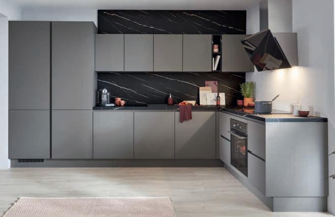 Nobilia-Küche aus dem Programm Easytouch, Front Lacklaminat grafitschwarz ultramatt mit Anti-FingerprintBeschichtung, Arbeitsplatte und Nischenverkleidung im Farbton Metal oxid. Mit Elektrogeräten von Privileg und Einbauspüle.