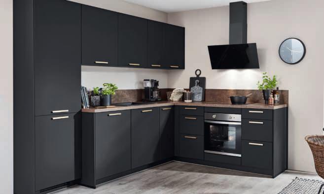 Nobilia-Küche aus dem Programm Easytouch, Front Lacklaminat grafitschwarz ultramatt mit AntiFingerprint-Beschichtung, Arbeitsplatte und Nischenverkleidung im Farbton Metal oxid. Mit Elektrogeräten von Privileg und Einbauspüle. Maße ca. 277x217 cm. Ohne Deko.