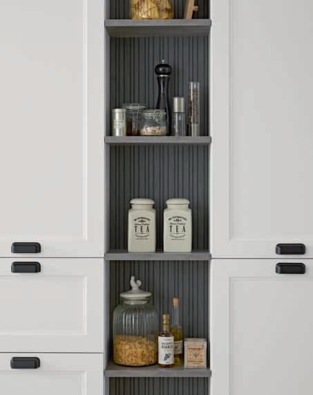 Das großzügige Regal im Hochschrank bietet viel Platz für Vorräte und Küchenutensilien.