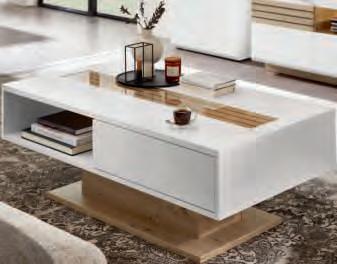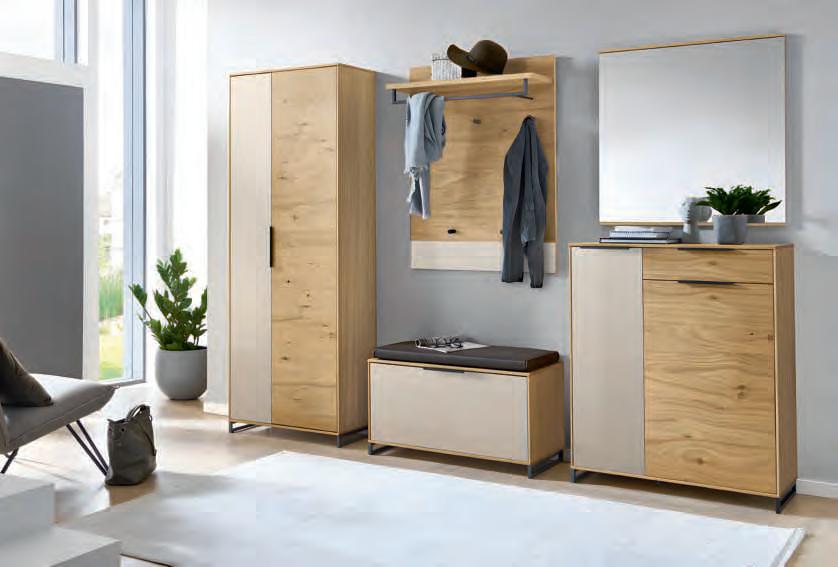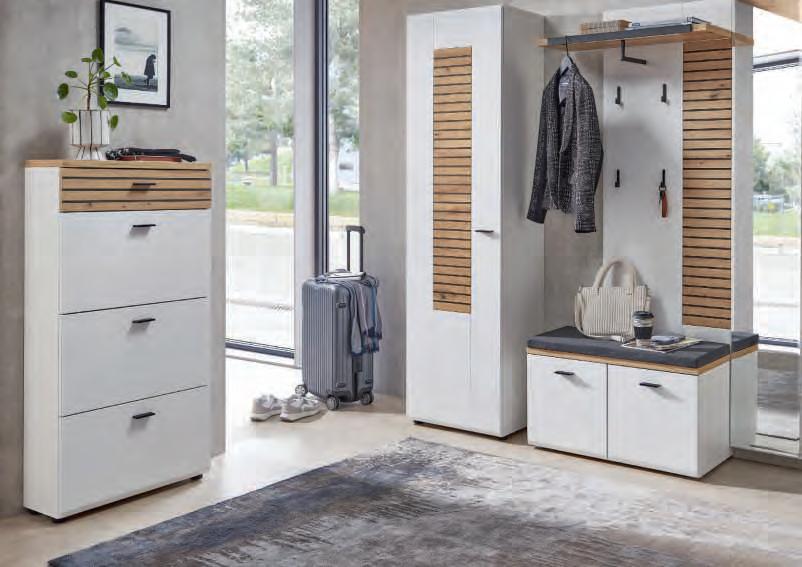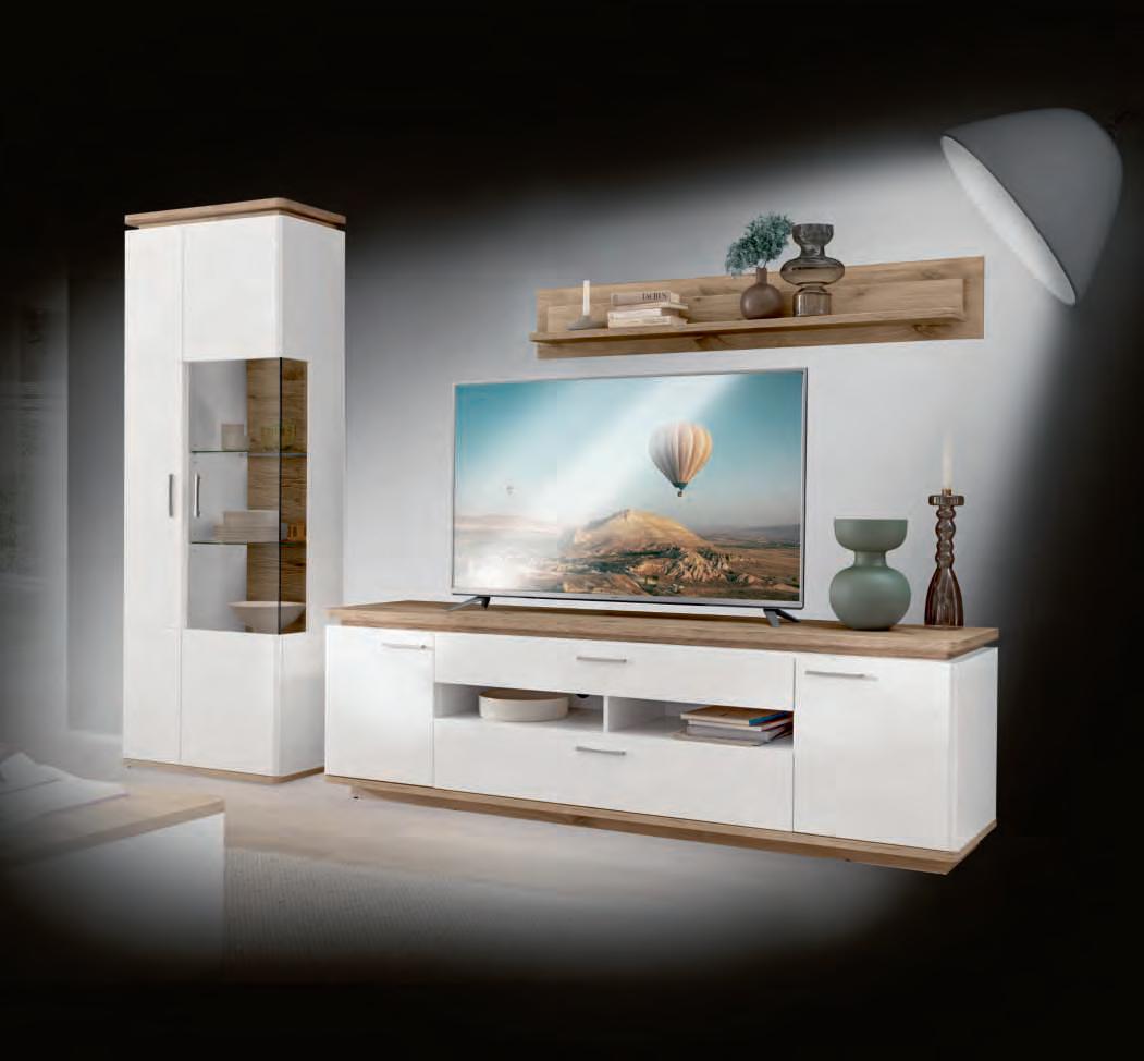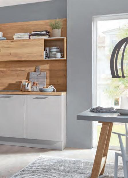 WOHNPROGRAMM, Front und Korpus weiß matt, Absetzung Artisan Eiche Nachbildung, Leistenoptik in Front und Rückwand, Parsolglas. Wohnconcept