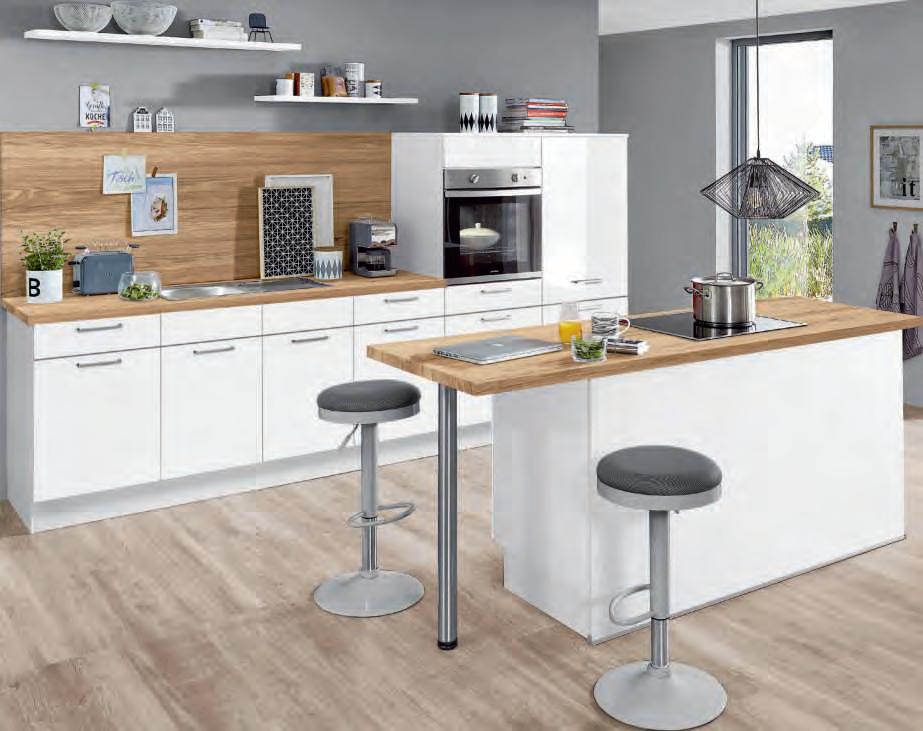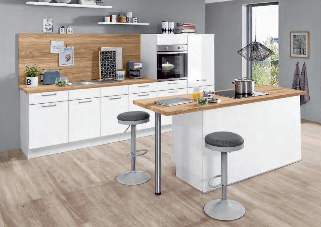 Interliving Küche Serie 3081, Front Lacklaminat weiß Hochglanz, Korpus weiß, Arbeitsplatte, Regalboard und Nischenregale Natureiche edelmatt Nachbildung, best. aus: U-Küche mit Kurzhängern. Ausgestattet mit Privileg-Elektrogeräten und Einbauspüle mit Armatur. Maße ca. 250x269x188 cm. Ohne Deko. M997213 005 391 6118