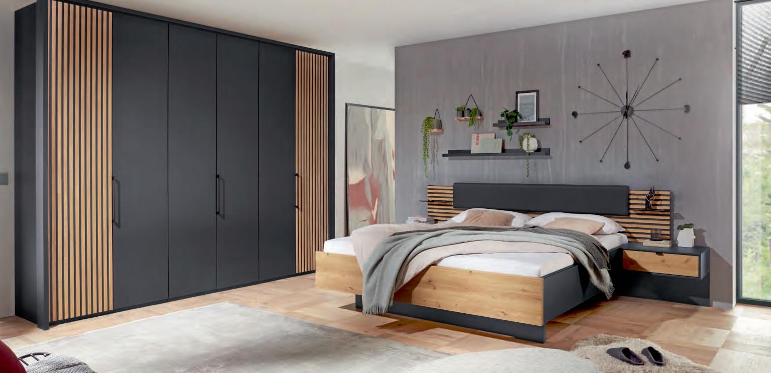 SCHLAFZIMMER-PROGRAMM, Front und Korpus graphit, Absetzung Bianco-Eiche Nachbildung, best. aus: 6-trg. Kleiderschrank , inkl. Passepartoutrahmen, ca. B306/H220/T65 cm, Futonbett mit KunstlederPolsterkopfteil, Bezug: 74% Polyvinylchlorid, 26% Baumwolle, Liegefläche ca. 180x200 cm, 2 Hänge-Nachtkonsolen mit 1 Schubkasten, ca. B60/H43/T43 cm. Partnerring