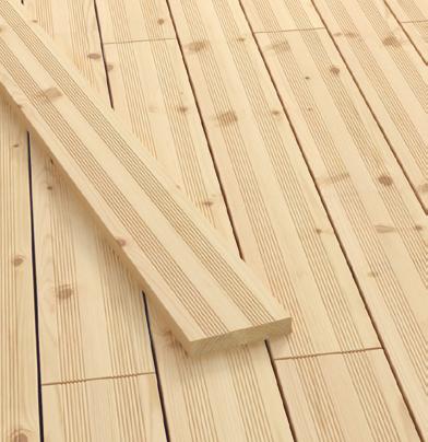 Eine Seite teilgeriffelt, andere Seite glatt gehobelt, barfußfreundlich, da ohne chemische Behandlung, B 12 cm, L 2, 3 oder 4 m, Stärke 2,1 cm.