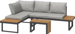 Bestehend aus einem Tisch (T 35 x B 70 x H 41 cm) und zwei ZweisitzerElementen, einfach verwandelbar in Ecklounge, Sitzgruppe, Sonnenliegen oder Sonnenbett, aus FSC-Akazienholz und pulverbeschichtetem Aluminium in Anthrazit. Art.-Nr. 5252515 für Flächen bis 300 m²