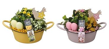 bepflanzte Zinkschale mit Kalanchoe, Fittonia, Hedera und Oster-Deko, Topf-Ø ca. 19 cm.
