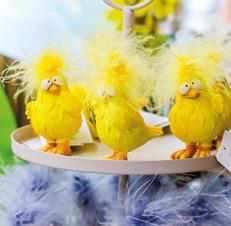präsentieren sich z. B. hauptsächlich in den Farben gelb und grün, also eine natürliche Note in der Deko. Das verleiht den Arrangements eine klassische Leichtigkeit. Golden Easter hingegen bringt einen Hauch Eleganz ins Spiel. „Unsere Osterhasen und Küken haben goldene Akzente – sei es durch goldene Ohren, goldene Eier oder goldene Karotten. Es ist eine stilvolle