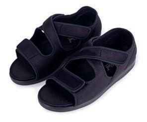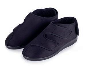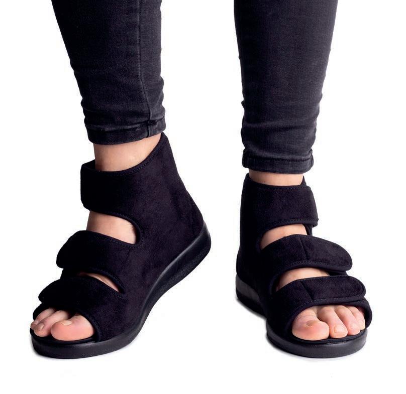 Dank der langen Riemen können Sie die Schuhe auch bei stark geschwollenen oder bandagierten Füßen anpassen. Die erhöhte Version des Verbandsschuhs stärkt auch den Knöchelbereich.