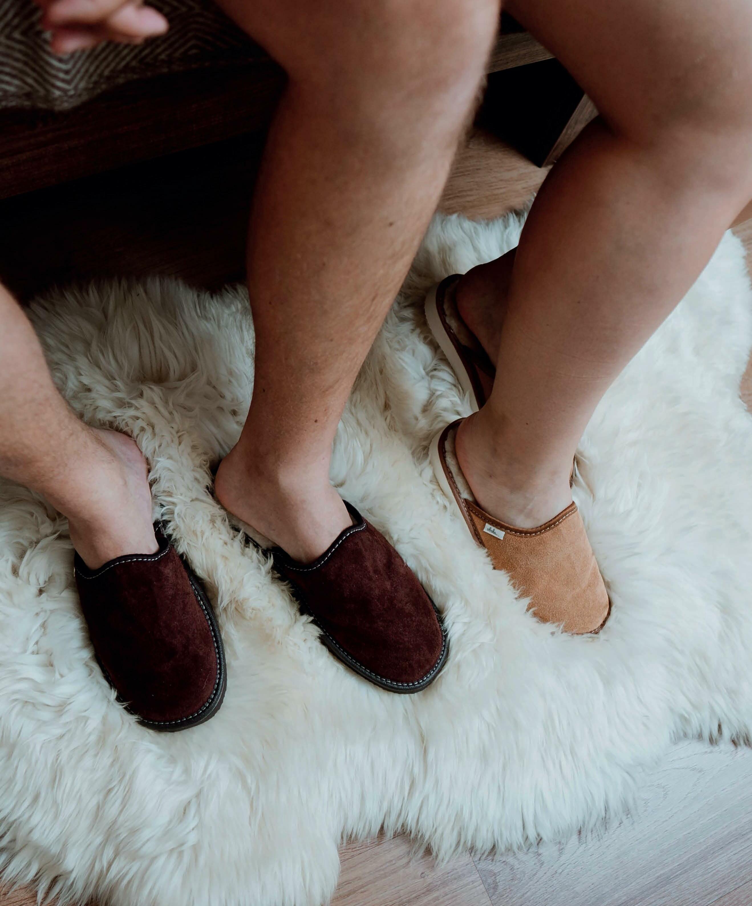 Außergewöhnlich weiche Hausschuhe aus feinem Schafsleder und Wolle. Gr. 41–46.