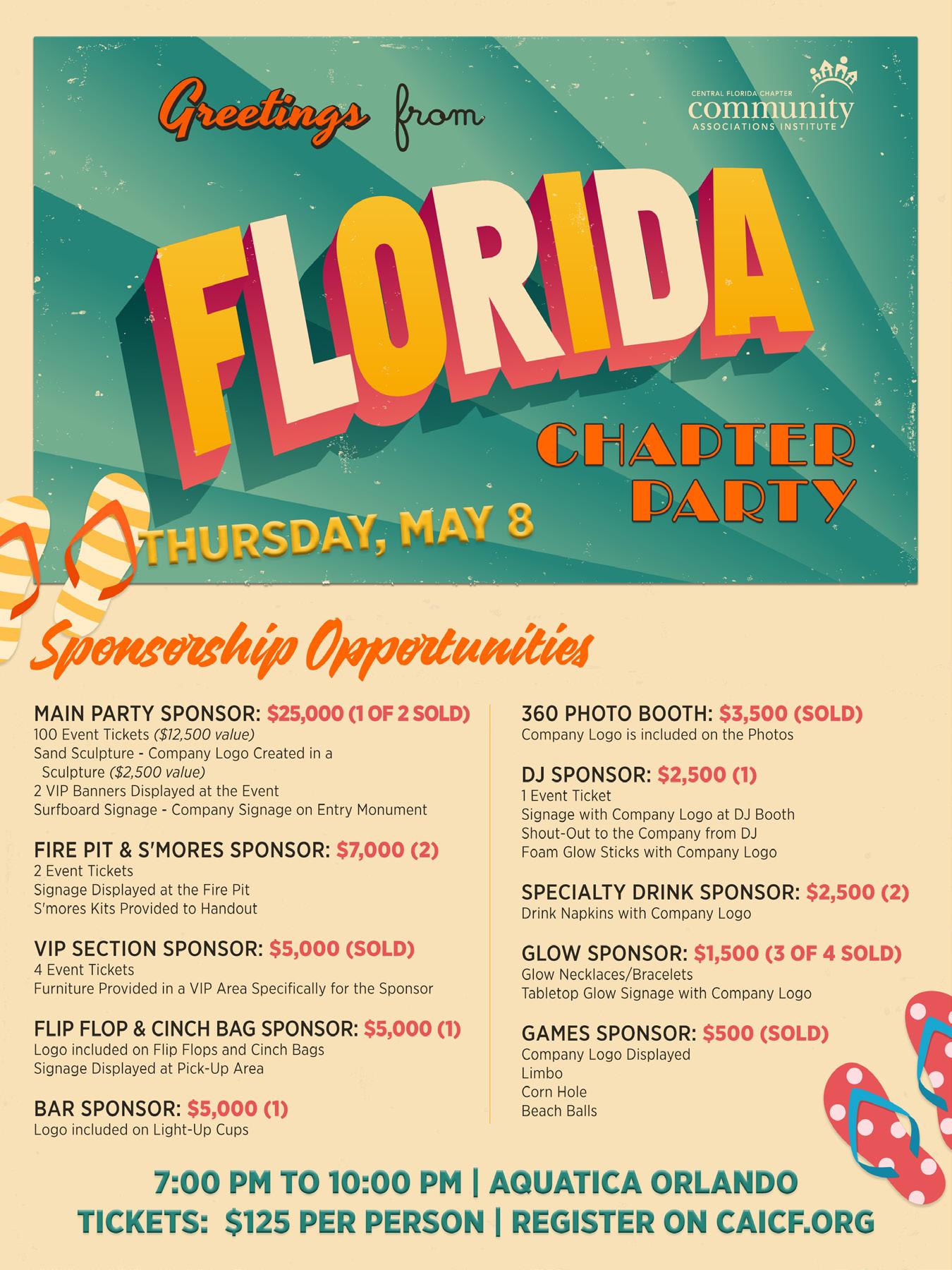 • May 8, 2025: Chapter Party from 7:00 - 10:00 pm. Greetings from Florida! Join us for a night of food, fun and drinks at Sea World’s Aquatica! Grab a pair of flip flops and enjoy the beach and games. Tickets are $125, which includes two drink tickets and dinner. Many sponsorship opportunities available! Don’t miss the opportunity to showcase your business on a national level at this event! Click here for more information and to register.