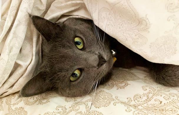 Frankie Marie, a stunning Russian Blue, turned 11 this past September. Her journey to Toni was an unexpected one. Rescued during a brutally cold New York winter, Frankie Marie and her siblings were found abandoned in a parking lot. A friend posted her photo on Facebook, and although Toni wasn’t looking for another pet, she instantly fell in love with Frankie Marie’s face and knew she had to give her a forever home. She adopted her when she was just under three months old.