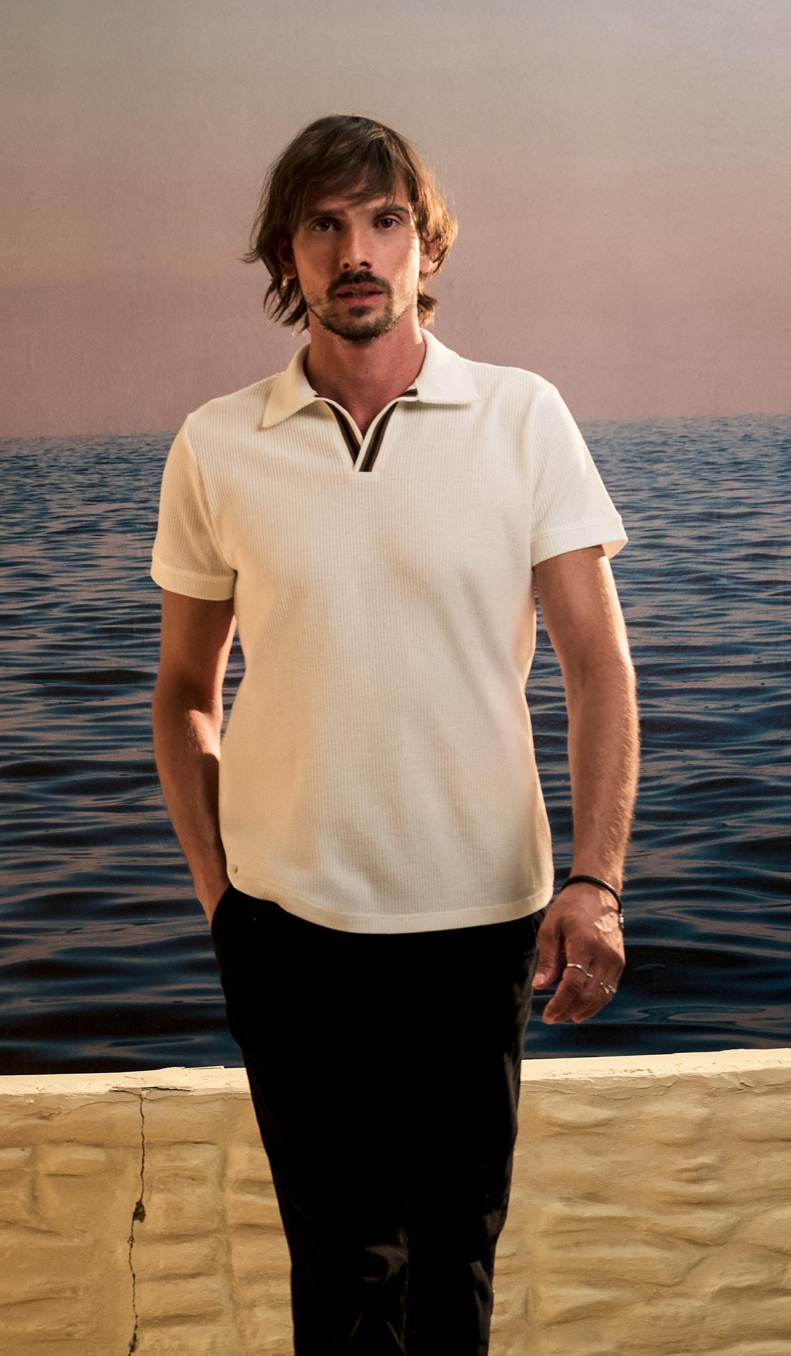 A MODELAGEM VALORIZA O CORPO SEM MARCAR: CAMISAS AMPLAS, BERMUDAS QUE RESPIRAM, POLOS QUE ACOLHEM. TUDO NA MEDIDA DO ESSENCIAL. NADA MAIS. NADA MENOS.