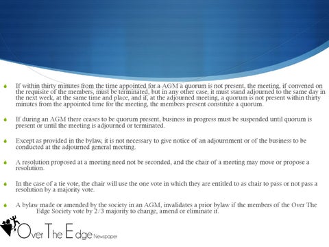 A bylaw made or amended by the society in an AGM, invalidates a prior bylaw if the members of the Over The Edge Society vote by 2/3 majority to change, amend or eliminate it.