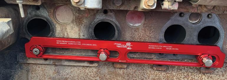 For the Cummins repair, Frew turned to ProMAXX Tool’s adaptable Bullit broken bolt repair kit. It has adjustable carriages that allow the tool to configure to just about any linear bolt pattern, eliminating machine tolerances. It comes with fasteners which lock the sliding carriages down, replicating the bolt pattern precisely.