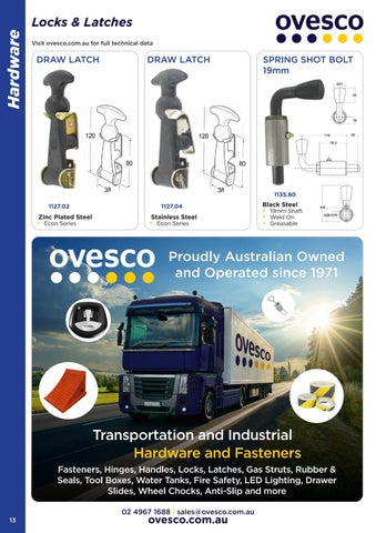 Transportation and Industrial Hardware and Fasteners Fasteners, Hinges, Handles, Locks, Latches, Gas Struts, Rubber & Seals, Tool Boxes, Water Tanks, Fire Safety, LED Lighting, Drawer Slides, Wheel Chocks, Anti-Slip and more 13