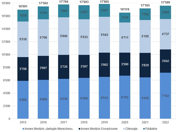 Durch die Einführung neuer Leistungskategorien in der Spitalplanung 2015 wird der Vergleich der Daten von vor 2015 mit jenen von nach 2015 in bestimmten Bereichen erschwert. So wurde die Geriatrie in «Innere Medizin betagte Menschen» und «polyvalente geriatrische Rehabilitation» unterteilt, um in den Leistungsaufträgen ab 2015 besser zwischen akuter Phase und Rehabilitation unterscheiden zu können. Aus diesem Grund wurde im vorliegenden Bericht nur die Periode 20152022 berücksichtigt.
