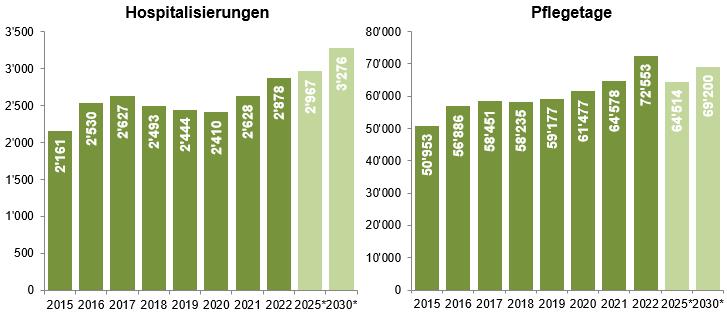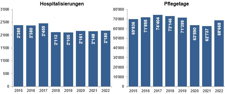 Über den gesamten Zeitraum 2015-2022 lässt sich eine Abnahme der Anzahl Hospitalisierungen und im selben Verhältnis der Anzahl Pflegetage feststellen, während die durchschnittliche Aufenthaltsdauer (DAD) ist im Jahr 2022 (31,5) um 1,2 Tage höher als im Jahr 2015 (29,3).