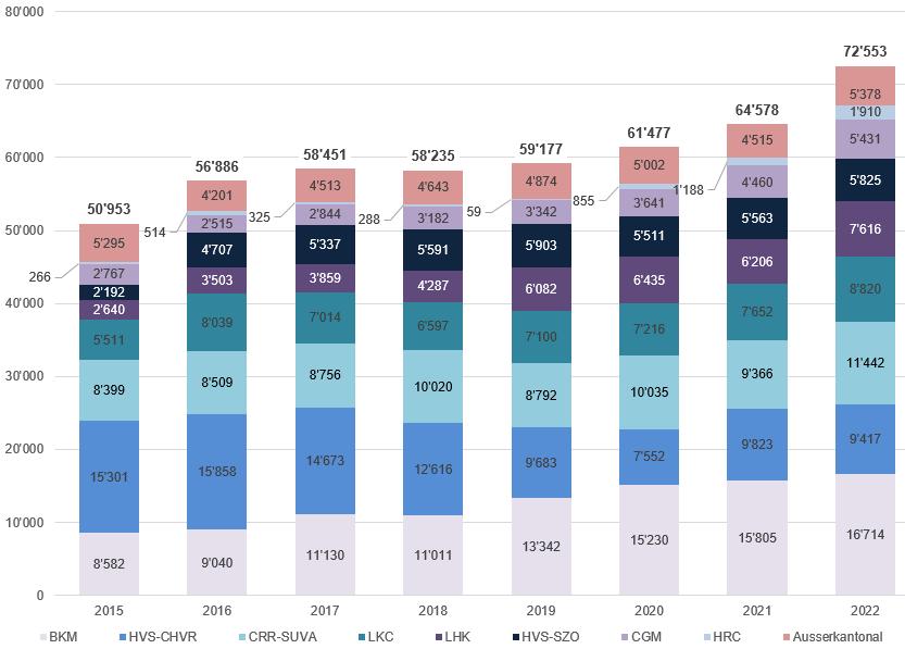 Im gesamtem Zeitraum 2015-2022 steigt die Zahl der Rehabilitationstage um 12,8% in einem geringeren Ausmass als der Anstieg der Fallzahlen (+19,6%), da in diesem Zeitraum ein Rückgang der durchschnittlichen Aufenthaltsdauer zu verzeichnen ist.