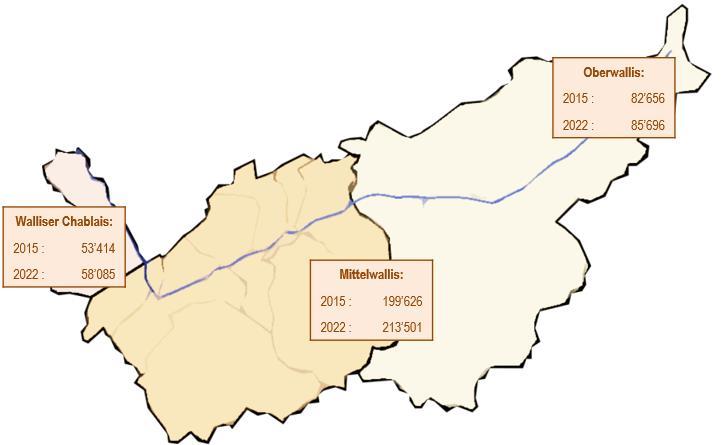 Zwischen 2015 und 2022 nimmt die Zahl der Hospitalisierungen in allen Bereichen zusammen betrachtet um 6,6 % zu (2015: 48'238 Fälle; 2022: 51’436 Fälle). Die Wohnbevölkerung des Kantons Wallis ist zwischen 2015 und 2022 um 6,4 % gewachsen; folglich nimmt die Hospitalisierungsrate ab, nämlich von 143,7 Hospitalisierungen pro 1'000 Einwohner im Jahr 2015 auf 144,0 Hospitalisierungen pro 1'000 Einwohner im Jahr 2022
