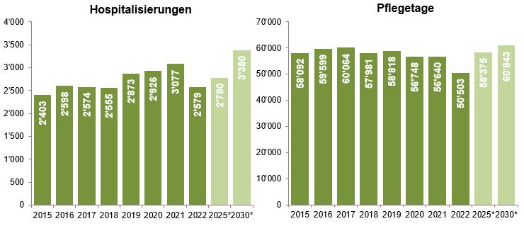 Zeitraum um 3,2% (-5'985 Tage) zurück, obwohl die Fallzahlen steigen (+7,8%), was auf die geringere durchschnittliche Aufenthaltsdauer in diesem Versorgungsbereich zurückzuführen ist.