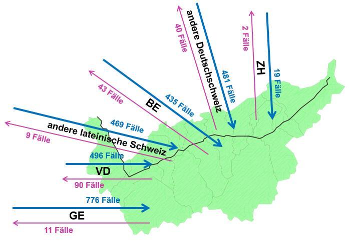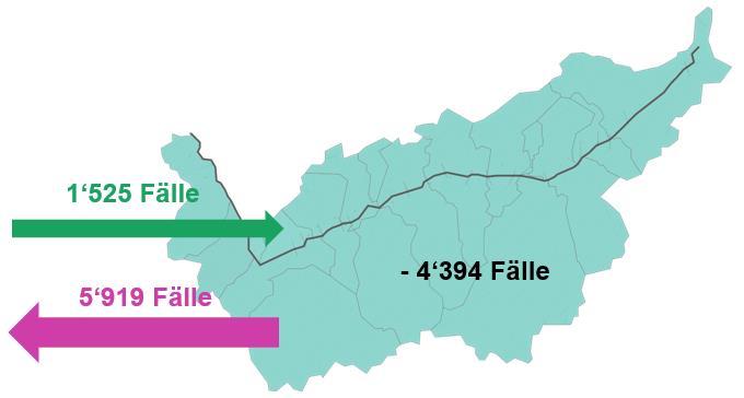 Der nachstehenden Abbildung können detailliert die Patientenströme von Walliser Patienten, die ausserhalb des Kantons stationär behandelt wurden, und von ausserkantonalen Patienten, die im Wallis stationär behandelt wurden, entnommen werden. Die meisten ausserkantonal stationär behandelten Walliser Patienten entfielen auf die Kantone Waadt (39,5 %) und Bern (29,0 %). Die meisten ausserkantonalen Patienten, die im Wallis stationär behandelt wurden, stammten aus dem Kanton Waadt (9 Fälle).
