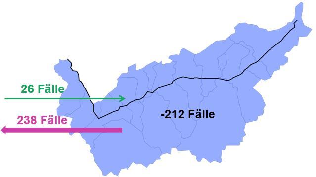 2022 wurden 89,1 % der stationären Walliser Patienten im Kanton behandelt. 26 Fälle, die ihren Wohnsitz nicht im Wallis hatten, wurden im Wallis behandelt, während 238 Fälle von Walliser Patienten ausserhalb des Kantons hospitalisiert wurden, was einem Migrationssaldo von -212 Fällen entspricht. Es sei daran erinnert, dass es in diesem Bericht einzig um die KVG-Fälle geht und dass Hospitalisierungen von Patienten mit Wohnsitz im Ausland sowie nicht-KVG-Patienten (stationäre Aufenthalte wegen Unfällen, Invalidität usw.) nicht berücksichtigt werden