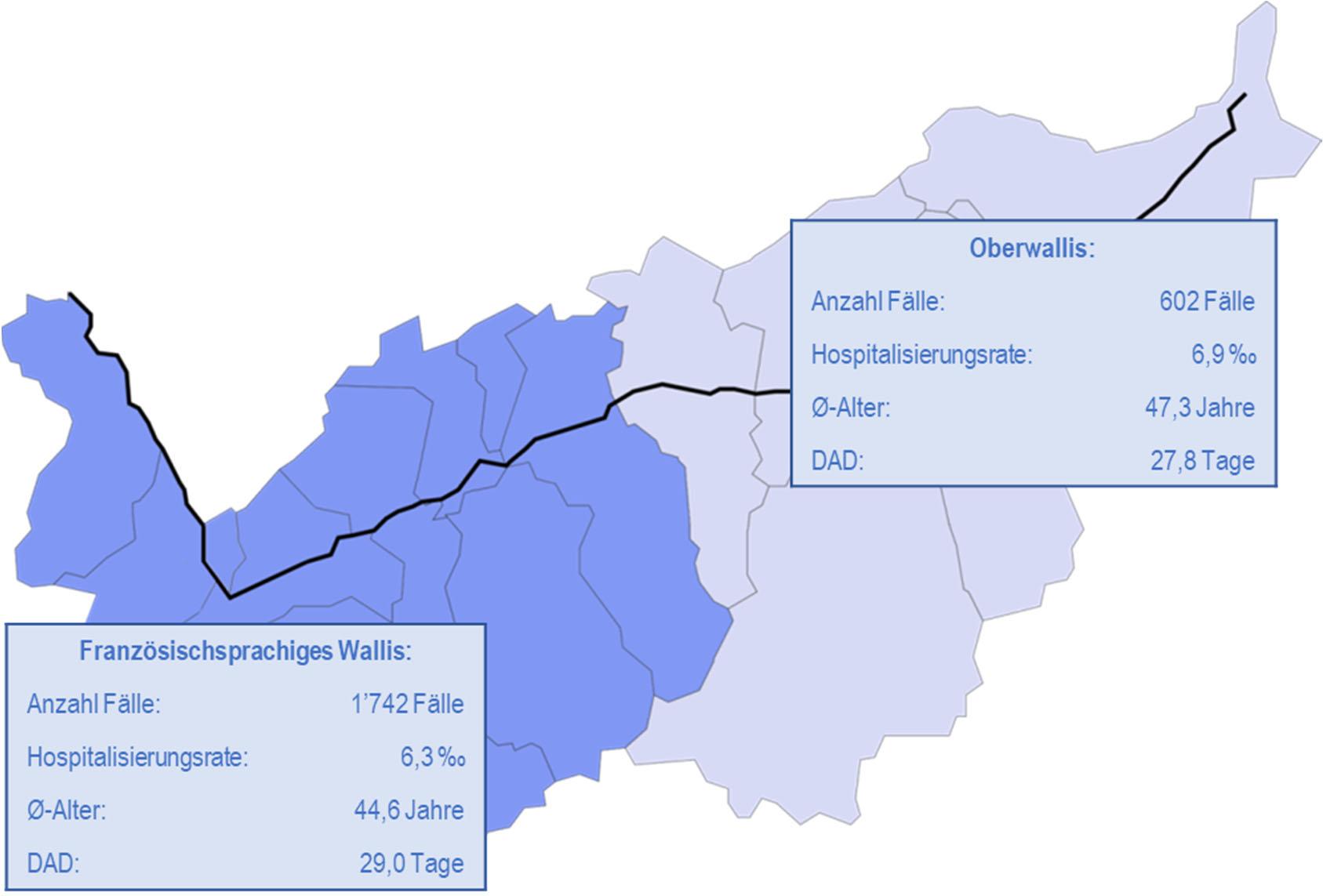 Die Besonderheit des Kantons Wallis besteht darin, dass in Montana drei Kliniken anderer Kantone liegen. Die Hospitalisierungen von Einwohnern aus den Kantonen dieser jeweiligen Kliniken wurden zu den FĂ€llen von Patienten, die ihren Wohnsitz nicht im Wallis haben und die sich im Wallis stationĂ€r behandeln lassen, gezĂ€hlt. Die Einzelheiten dieser FĂ€lle sind in Tabelle 29 unten aufgefĂŒhrt.