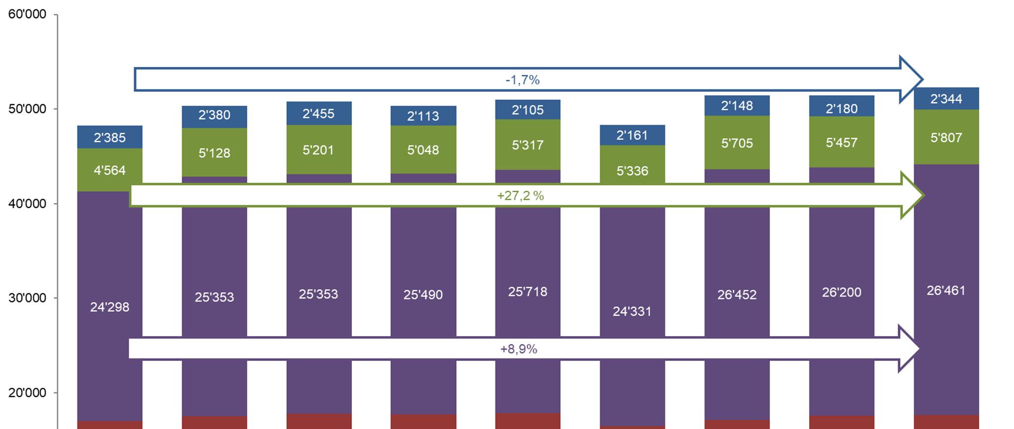 Ăber den gesamten Zeitraum 2015-2023 nimmt die Zahl der Hospitalisierungen in der Akutsomatik zu (+6,9% insgesamt; mit +4,0% in der Grundversorgung und +8,9% in der spezialisierten Akutsomatik). Die Zahl der Hospitalisierungen in der Rehabilitation nimmt wĂ€hrend des gesamten Zeitraums 20152023 konstant zu und betrĂ€gt insgesamt +27,2%. Die psychiatrische Fallzahl sinkt im gesamten Zeitraum 2015-2023 um 1,7%.