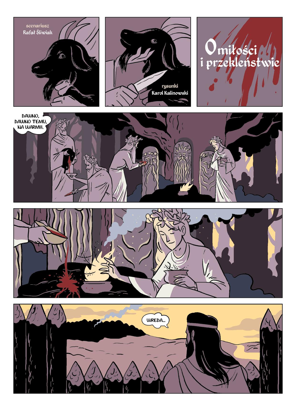 Dawno, dawno temu na Warmii... ...działy się rzeczy ważne, czasem straszne, a na pewno bardzo ciekawe. Znalazły one odzwierciedlenie w baśniach i podaniach, których korzenie sięgają czasów, gdy ziemię warmińską zamieszkiwali Prusowie. W niniejszej publikacji zaprezentowano trzy baśniowe historie, które podejmują próbę odnalezienia tych korzeni. Każdą z opowieści zilustrował inny artysta związany z regionem, nadając jej oryginalny i niepowtarzalny charakter. Za adaptację tradycyjnych baśni warmińskich na język komiksu odpowiadał Rafał Śliwiak, dziennikarz, redaktor, autor artykułów o atrakcjach turystycznych i dziedzictwie kulturowym Warmii i Mazur, wydawca komiksów. Jest on także stałym recenzentem miesięcznika „Nowa Fantastyka” i kwartalnika „SFinks”, publikując w nich omówienia książek oraz artykuły na temat fantastyki, literatury grozy i baśni.