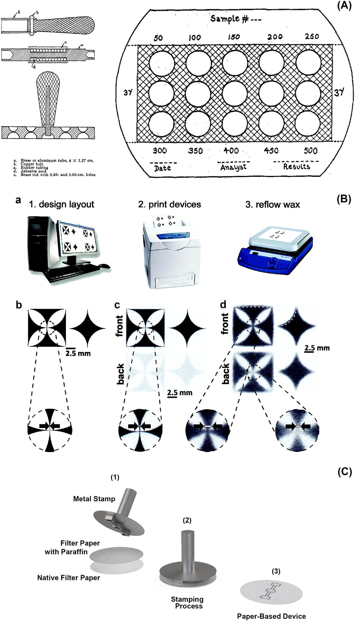 Aninterestinghistoricalpointregardingthepatternofpapersubstrate reportedbyYagoda [1] formicroanalysiswasthedescriptionofmanysubstancessuchaswaxes,resins,andcelluloseesterstostandardwater-repellent zonesonfilterpaper.Highlightingmainlytheuseofparaffinwaxduetoits generalinertnesstochemicalreagentsandtotheeasewithwhichitcanbe embeddedindiversepatternsonthepaper,astheuseofahotmetaltubefor melttheparaffinandtransfertoasheetofpaperinthering-shapedzones (Fig.1.4A) [1].Morethan70yearslater,Carrilhoetal. [16][16] describedthe technologicaladvancesthatallowedtheuseofacommercialscreen-printer controlledbycomputertoprintathinlayerofwaxinanydesireddesignto patternthepaperreproducibly,whichmovesthepaper-basedsensorstoward accuratequantitativeresults(Fig.1.4B).Severalstrategiesbasedonthe Yagodaapproachwerepublishedinthe2000s,likeusingahandheldstamping processtotransferparaffinfromparaffinedpapertoanotherusingapreheated metalstamptofabricatemicrofluidicPADs(µPADs)(Fig.1.4C) [17].