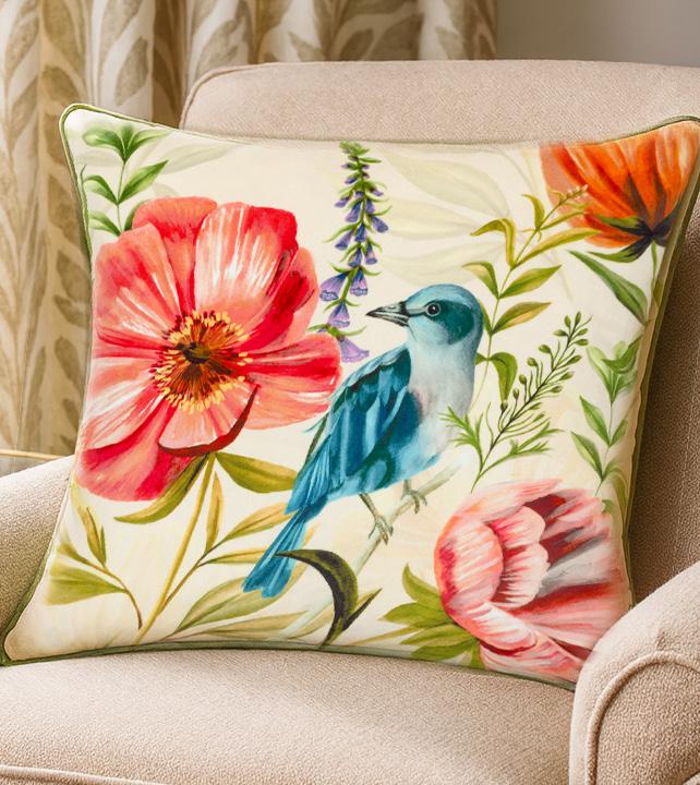 Decorated with a nature-inspired watercoloured Barn Owl and feather print, this plump decorative cushion will add country charm and comfort to your sofa. Size 16.9” (43 x 43cms) square.