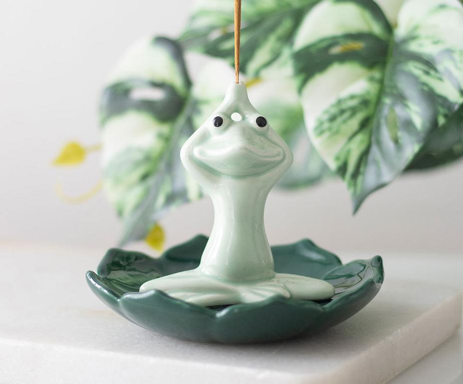 Calm the nerves and realign your chakras with this ceramic incense holder shaped like a yogi frog. Seated in a sukhasana pose in a green lotus flower, this holder will look charming on a side table or nightstand while catching falling ash. Sandalwood incense sticks included. Height 3.5” (9cms). Ref. G202358 £12.99