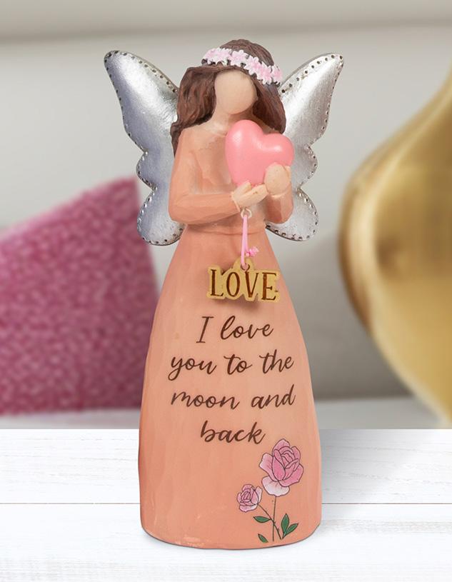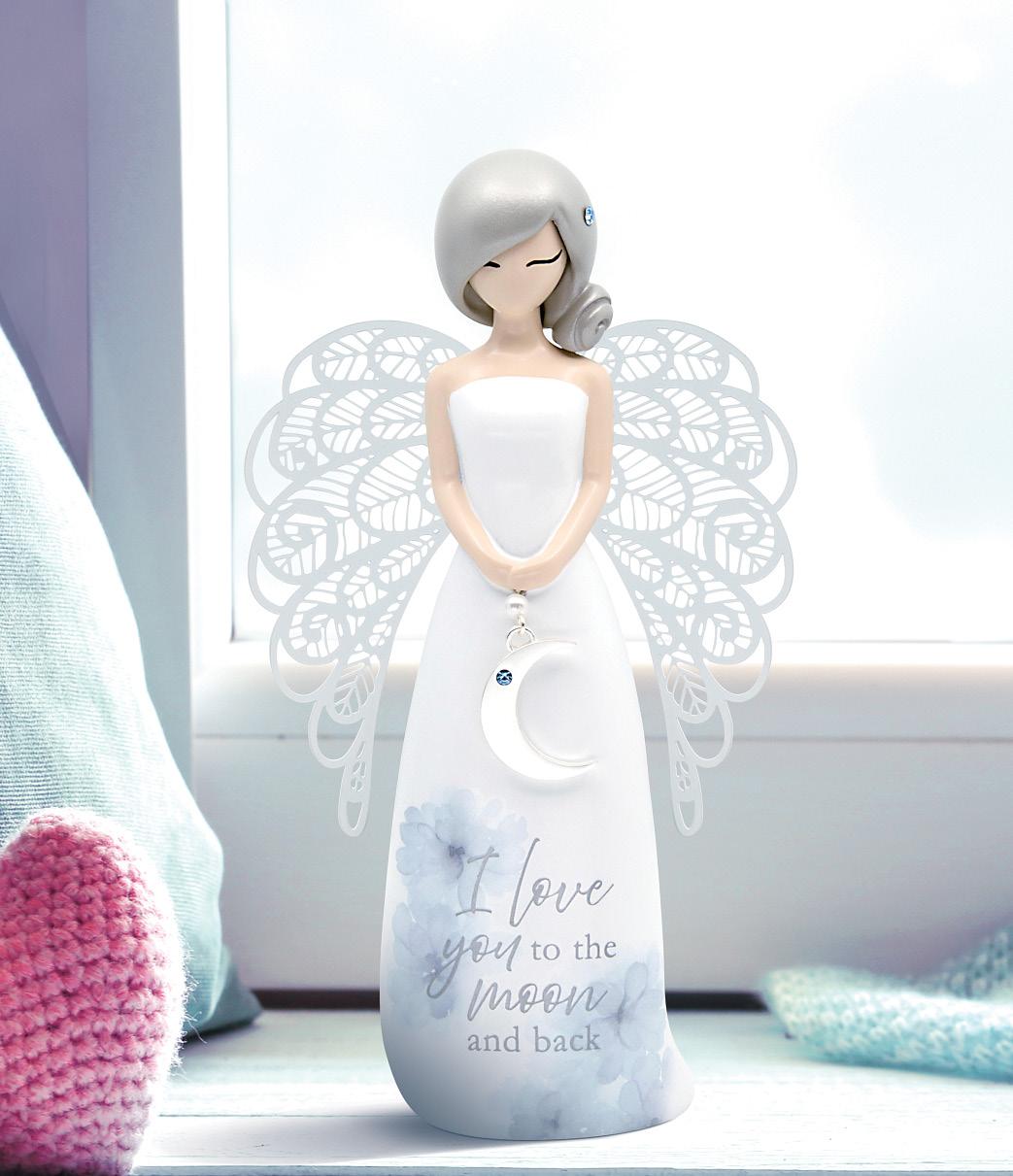 Surprise a beloved friend or family member with this angelic resin figurine inscribed with “I love you to the moon and back”. With sliver hair and shimmering silver wings, she carries a bejeweled crescent moon. Height 6.1” (15.5cms) tall. Ref. G202164 £29.99