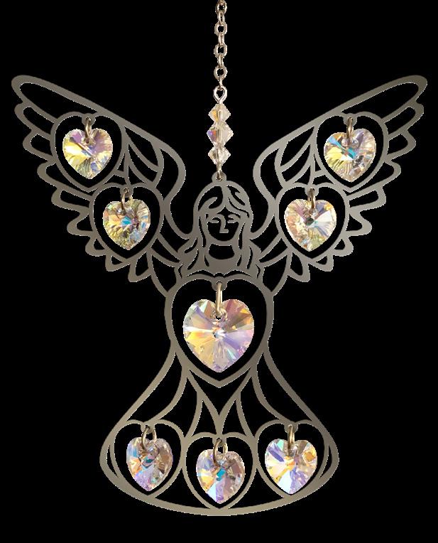 Simply hang this elegant piece to let just one beam of sunlight fall onto this polished foil angel for a room full of sparkling, shimmering rainbows. Decorated with 8 aurora borealis heart shaped cut crystals, size 3.1 x 3.1” (8 x 8 cms). Ref. G199585 £29.99
