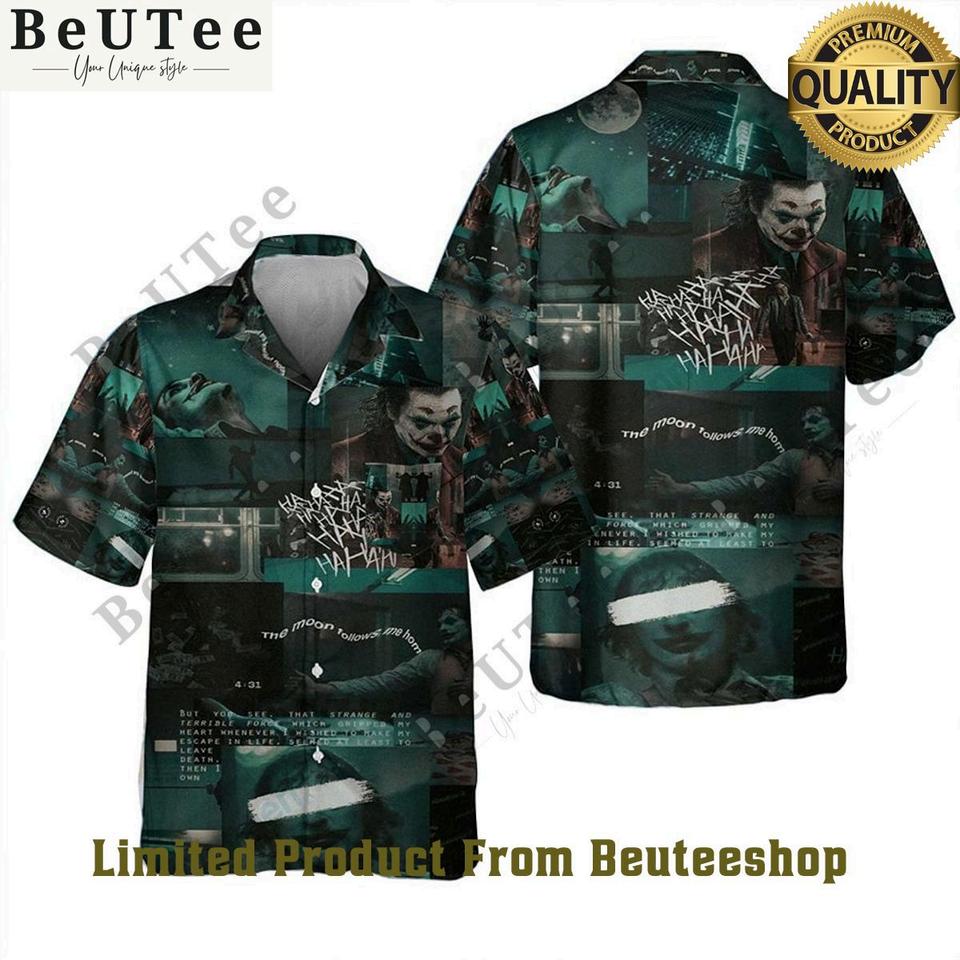 This unique and eye-catching Hawaiian shirt features a captivating design inspired by the infamous DC Comics villain, the Joker. The shirt’s vibrant colors and bold patterns create a striking visual, making it a standout piece for any wardrobe. The central image showcases the Joker standing beneath a full moon, accompanied by his signature maniacal laughter. The phrase “The Moon follows me home hahaha” is printed across the back, adding to the shirt’s playful and edgy appeal. Crafted from high-quality materials, this shirt is both comfortable and durable, perfect for casual wear or special occasions. Whether you’re a die-hard fan of the Joker or simply looking for a statement piece, this Hawaiian shirt is sure to impress.