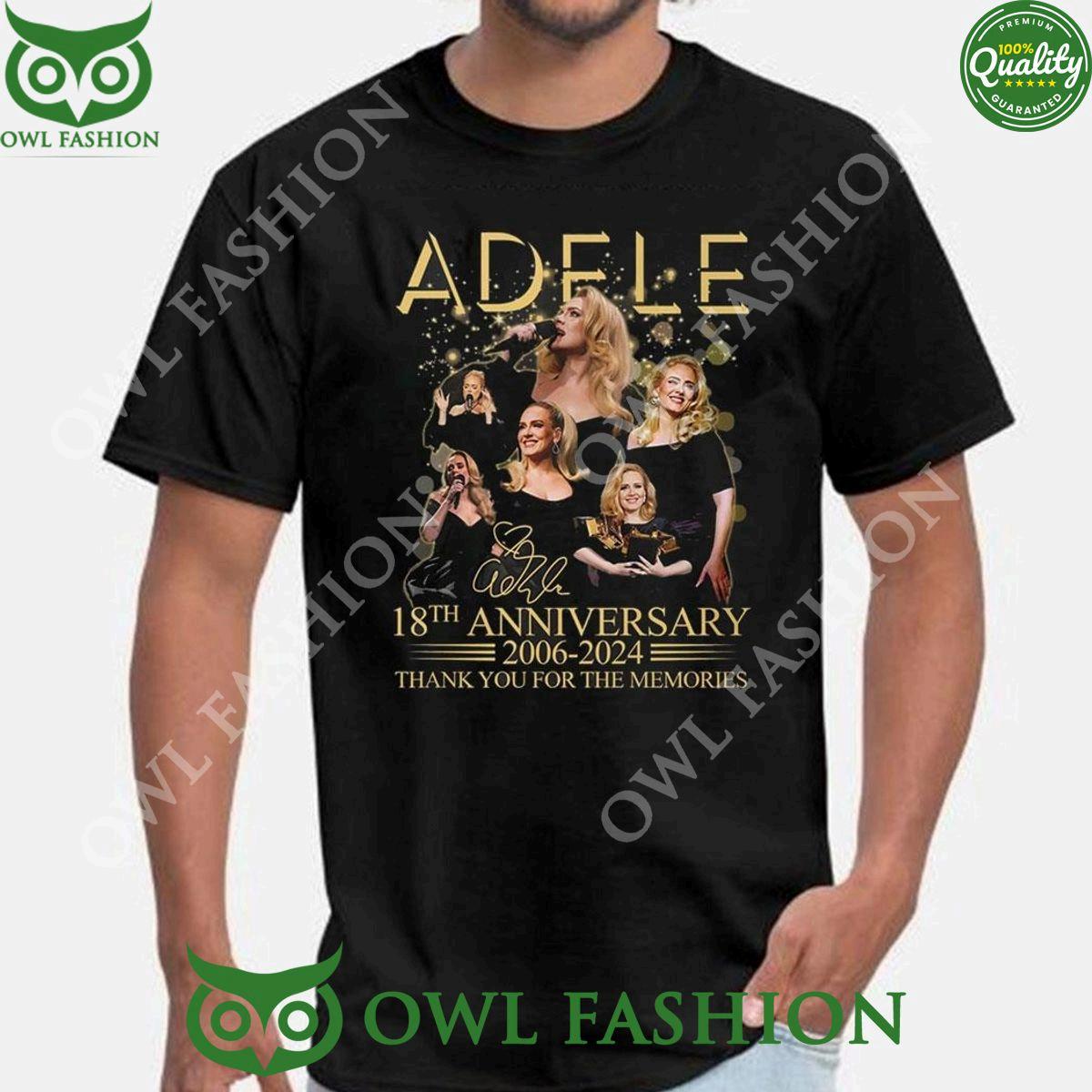 Celebrate the incredible career of Adele with this commemorative t-shirt. Marking her 18th anniversary in the music industry, this shirt is a tribute to the iconic singer. The front features a captivating image of Adele, along with her signature, while the back showcases a heartfelt message of gratitude for the unforgettable music and memories she has created. Crafted from high-quality materials, this t-shirt offers both comfort and style, making it a must-have for any Adele fan. Whether you’re attending a concert, listening to her music at home, or simply showing your appreciation for her contributions to the music world, this shirt is the perfect way to honor her legacy.
