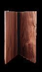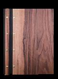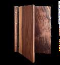 Portamenu in legno con due pannelli uniti da dettaglio in cuoio e viti in ottone per inserire i fogli. Soluzione elegante per la presentazione dei menu – legno di noce Wooden menu holder with two panels joined by a leather detail and brass screws to insert sheets. An elegant solution for presenting menus – walnut wood