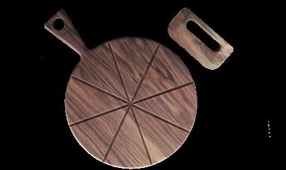 Tagliere per pizza con manico, smussato e con fresature per il taglio preciso. Ideale per servire in tavola. Completo di taglia pizza con impugnatura di facile presa, entrambi realizzati in legno massello – legno di noce Pizza board with handle, beveled edges and grooves for precise cutting. Perfect for serving at the table. Complete with easy-grip pizza cutter, both made of solid wood – walnut wood