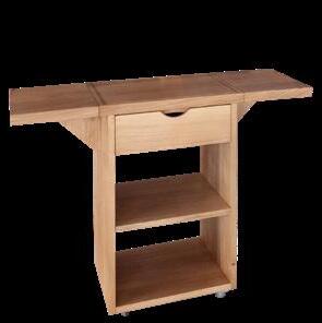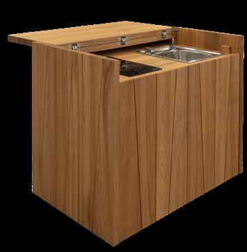 Cucina portatile su ruote interamente in legno massello di rovere o olmo, composta da un piano d’appoggio apribile, un ripostiglio nel sotto lavello, e uno spazio per un piano cottura e un lavandino