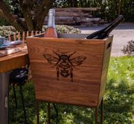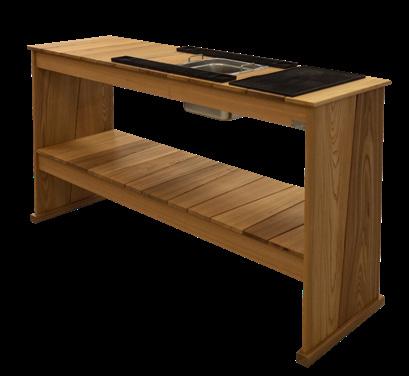 Balcony bar interamente in legno massello di noce o olmo, facilmente movibile all’occorrenza. Dispone di 2 piani per l’appoggio e di uno spazio per un contenitore in acciaio rimovibile per contenere il ghiaccio