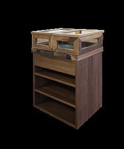 Carrello di servizio con cassetto frontale, due ripiani di appoggio e piano superiore con piastra in grès estraibile, dotata di scavo impermeabile per elementi refrigeranti da congelatore. Completo di vetrinette in vetro apribili, utilizzabili come piani di servizio, maniglie laterali e ruote per lo spostamento - legno di noce