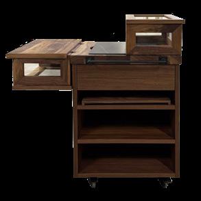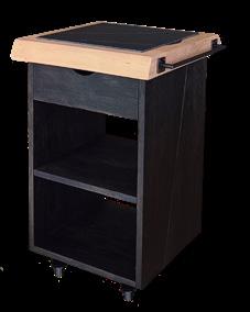 Cart with drawer and two storage shelves, cedar top with removable black or white stoneware slab for easy cleaning. Functional and elegant