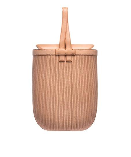 SHANG XIA 上下以中国竹篮为灵感,模拟其构造与肌理,以 立体塑型法革新工艺,耗时五年推出了揽月系列缂丝皮包 袋。缂丝皮使用柔韧度上等的头层牛皮处理而成。宽度 一致、易于编制。编织方法仿效江南缂丝工艺,呈现如同 竹编的丰富肌理与立体质感。经纬之间,以传统工艺重现 东方的摩登气质。