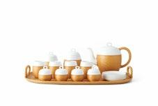 竹丝扣瓷是国家级非物质文化遗产的工艺,SHANG XIA 上 下桥系列竹丝扣瓷茶具采用“双线交叉走丝”的立体编织 工艺,经篾和编篾都增加到两根,编织效果大为提升。工 艺师仅用一把简单的刀,手工将竹子劈成细丝,紧贴瓷面 编织,竹编的每一处接头藏而不露。百斤原竹,只抽丝八 两。所使用的竹丝最细可达 0.33 毫米。白瓷功夫茶具由 1300 度以上高温烧制而成,光泽温润如玉。