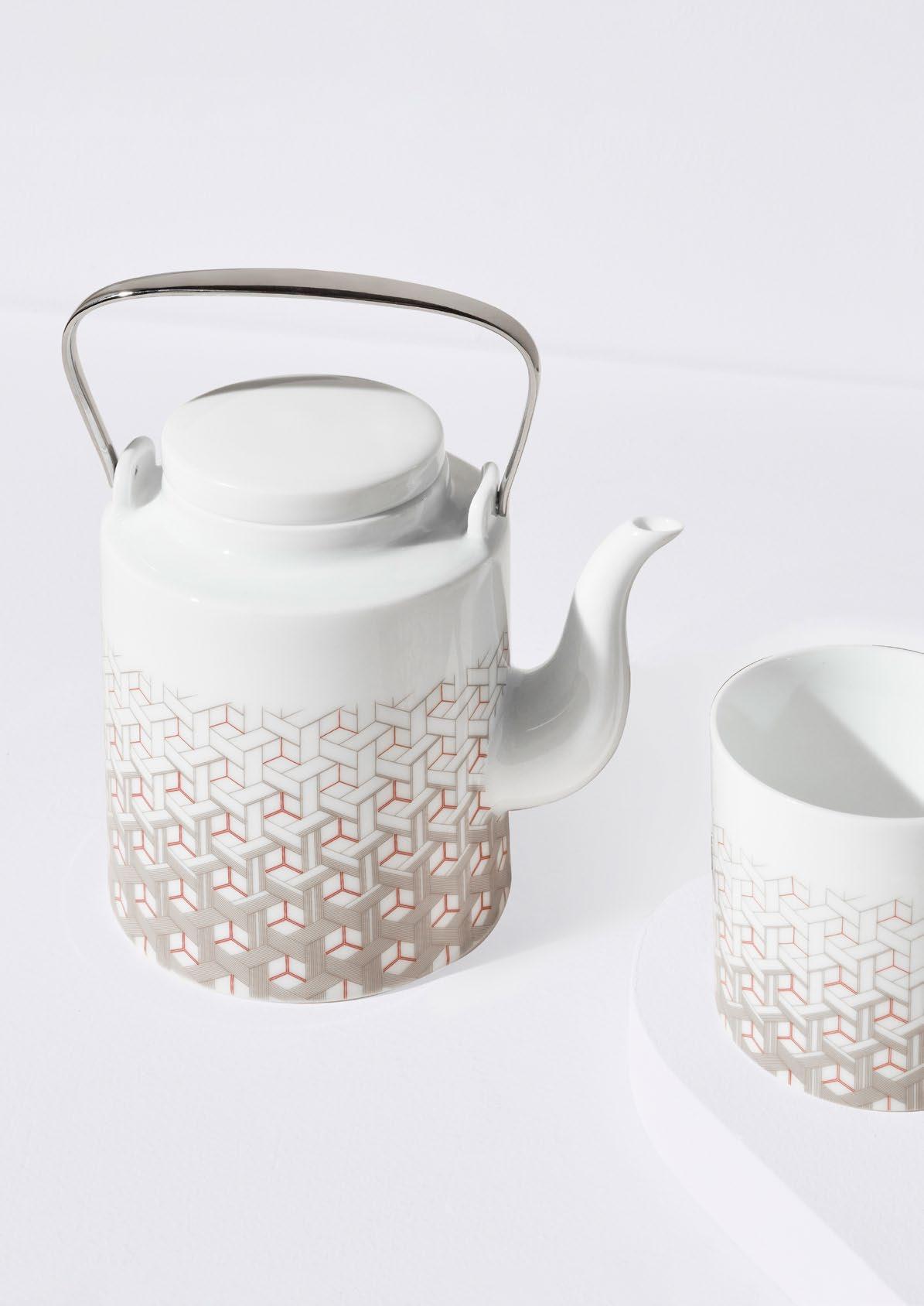 Bamboo weaving has ancient roots in China. Artisans handsplit bamboo into fine threads and meticulously weave them onto the porcelain surface, hiding each joint with exceptional skill. SHANG XIA’s bamboo weaving porcelain uses a threedimensional double-line interlaced weaving technique. Thousands of these bamboo threads, some as thin as 0.33 millimeters, must be manually crafted since no machine can replicate this process. The white porcelain tea sets are fired at temperatures above 1300 degrees Celsius, resulting in a lustrous finish.