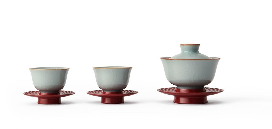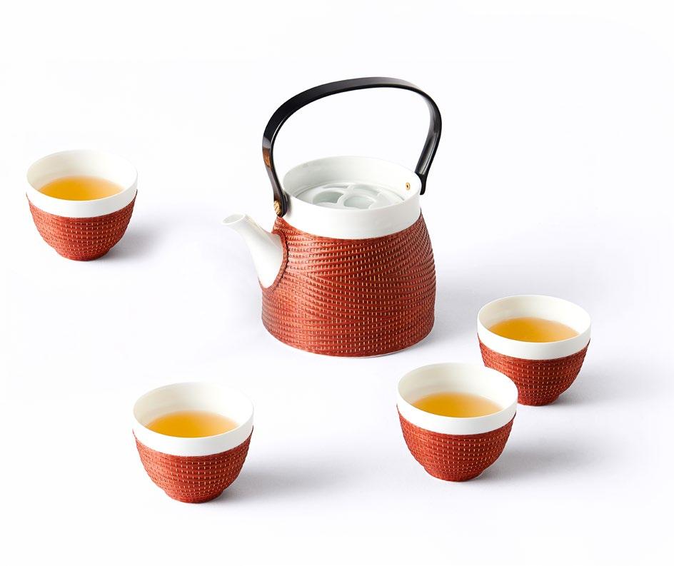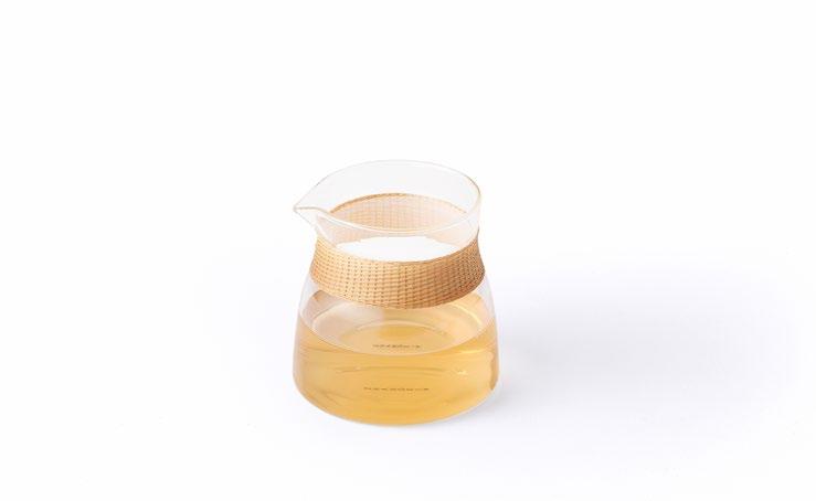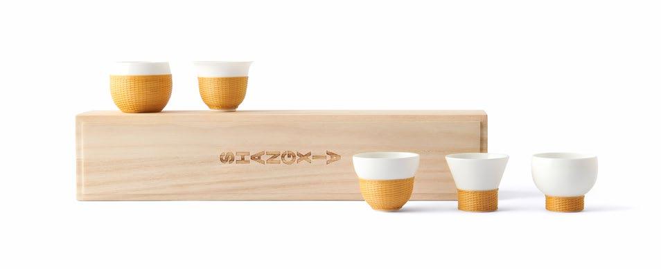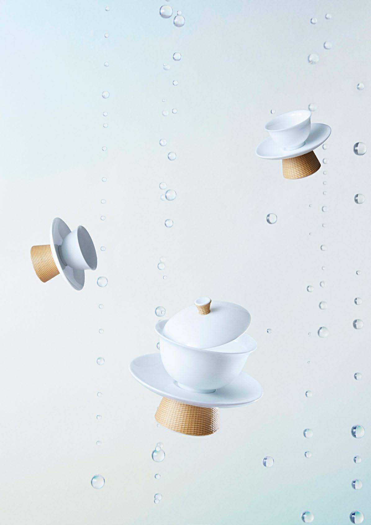 竹丝扣瓷是国家级非物质文化遗产的工艺,SHANG XIA 上 下桥系列竹丝扣瓷茶具采用“双线交叉走丝”的立体编织 工艺,经篾和编篾都增加到两根,编织效果大为提升。工 艺师仅用一把简单的刀,手工将竹子劈成细丝,紧贴瓷面