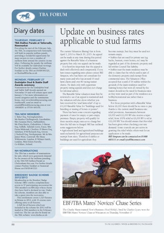 become exempt, but they must be used not remain empty. • Stables that are used for private use (eg hacks, hunters, event horses, etc) may be regarded as part of the domestic property and fall within Council Tax liability. • Stables near the main residence may be able to claim that the whole yard is part of the domestic property and exempt from commercial rates. The Valuation Office accepted that a yard of 16 stables within the grounds of the main residence used for training horses that were all owned by the trainer should not be rated for business rates as they were used as part of the residence as a hobby/recreational use rather than a business. For those properties with a Rateable Value below £6,000 there should be no rates to pay thanks to the current small business rate relief provisions. Assessments between £6,000 and £12,000 RV also receive a taper relief, from 100% relief at £6,000 RV to nil at £12,000 RV. You should ensure that this relief has been given when checking your rate demand. Some councils are pro-active in granting this relief whilst others wait for an application to be made. Bill Simpson can be contacted on 01488 685111 or email tyto@btconnect.com