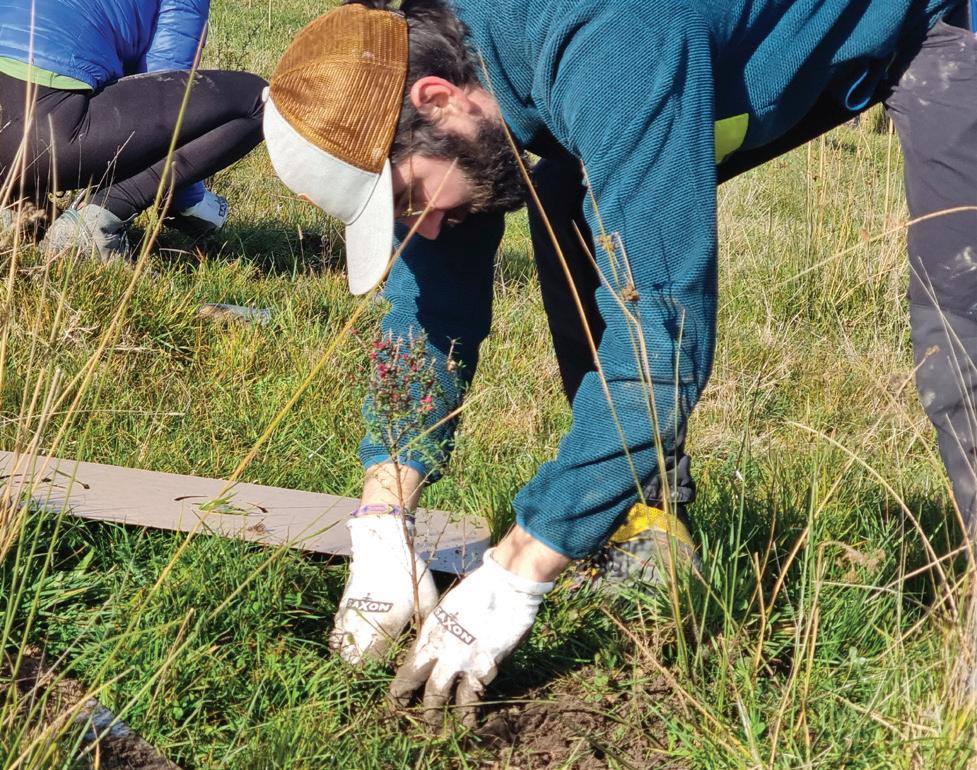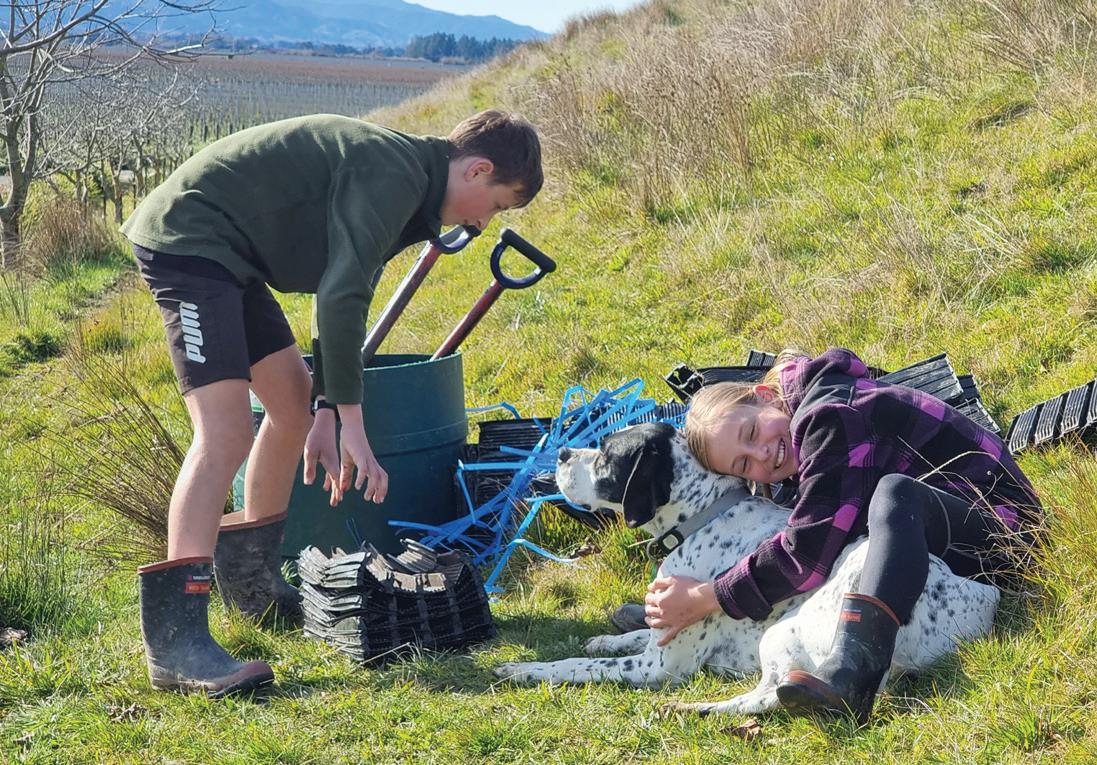 Photos this page: Volunteers fan out across the landscape; Luca plants; Thomas, Leonie and winery dog Flint collect root trainers for the nursery to reuse.