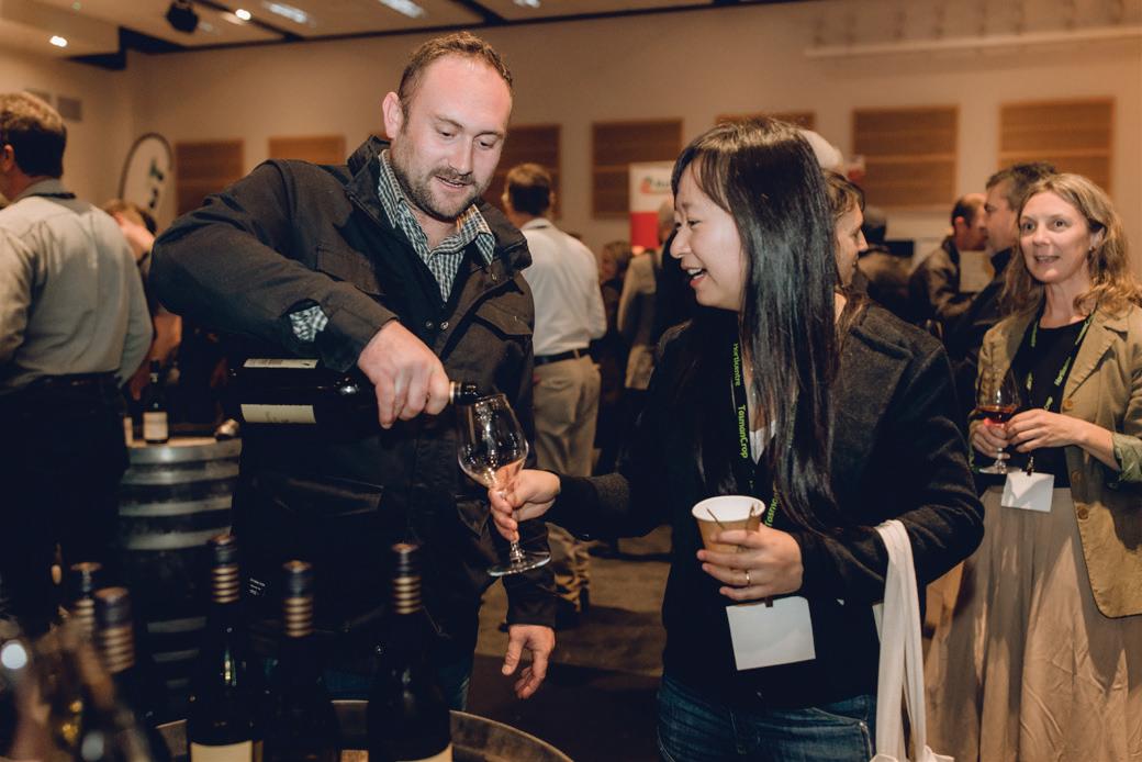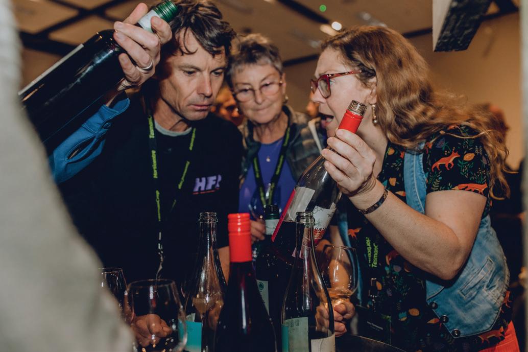 • South African organic winegrower Johan Reyneke (left), who also gave two keynote addresses on his experiences, poured his own wines at the International Organic Wine Takeover event.