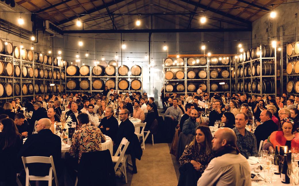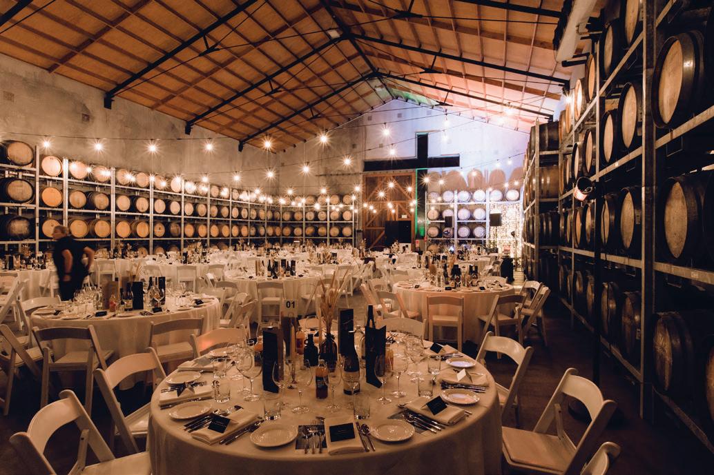 • The barrel hall at the Coterie transformed into a stunning feast venue at night.