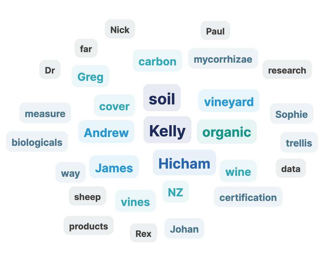 Multiple speakers also addressed the potential for biochar to support soil health and carbon sequestration. Presenting long-distance by video, James Dicey from Central Otago shared his trials in creating and applying biochar in the vineyard. Researcher Dr Vinay Pagay, based at the University of Adelaide, shared promising initial results of a research trial applying biochar to vineyard soils. In the trial, biochar appears to be absorbing and storing water in soils, as well as increasing soil carbon, cation exchange capacity and soil microbial biodiversity.